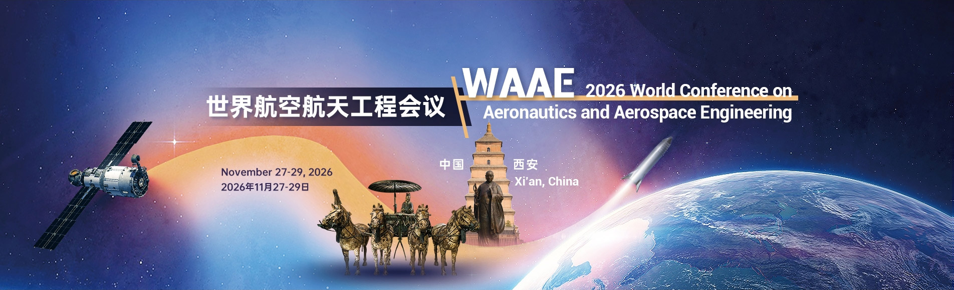 It is a great pleasure for us to invite you all to participate as speaker, delegate, sponsor at the World Conference on Aeronautics and Aerospace Engineering (WAAE) , which will take place from November 27-29, 2026, in Xi'an, China. It's sponsored by Northwestern Polytechnical University, hosted by School of Civil Aviation, Northwestern Polytechnical University.